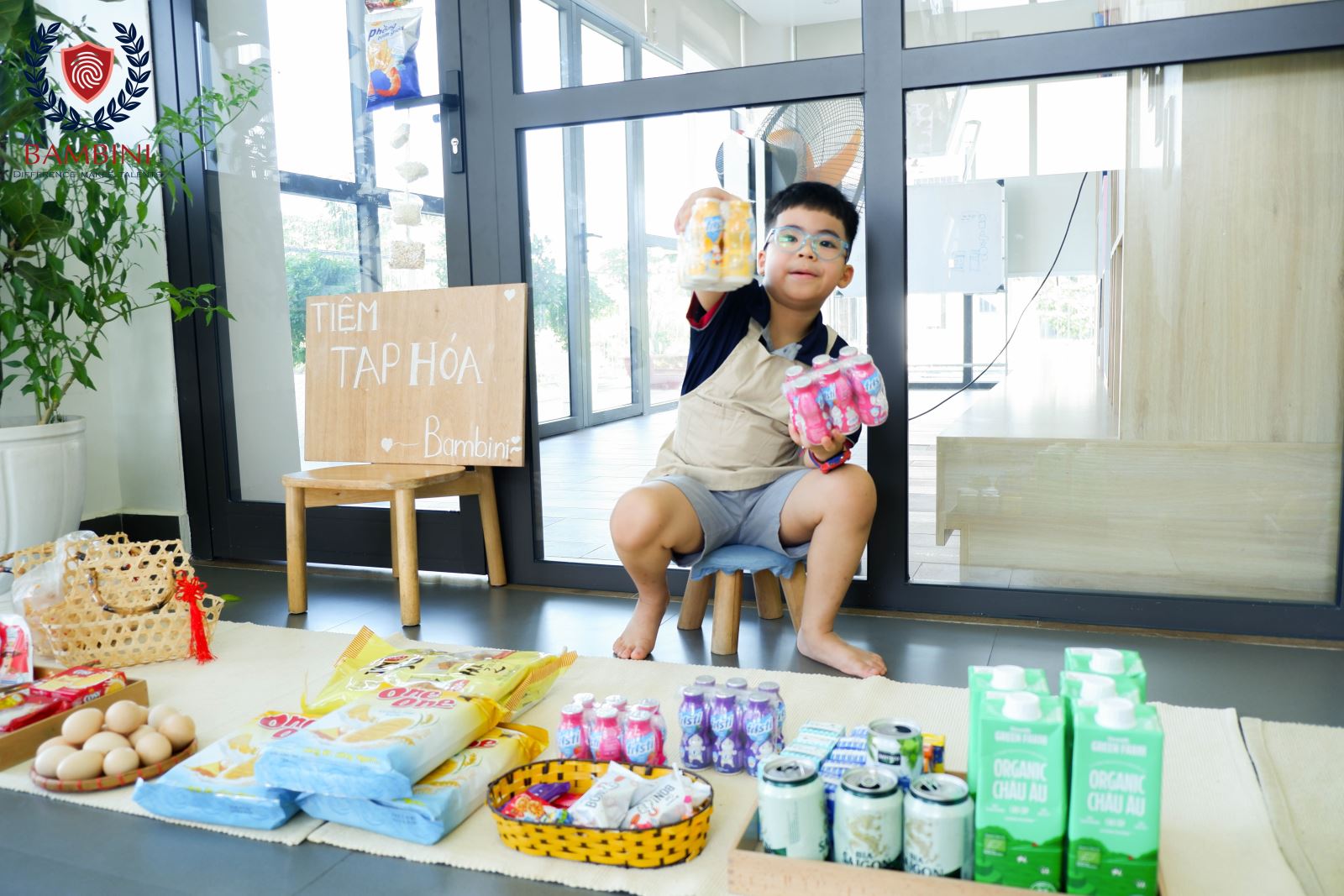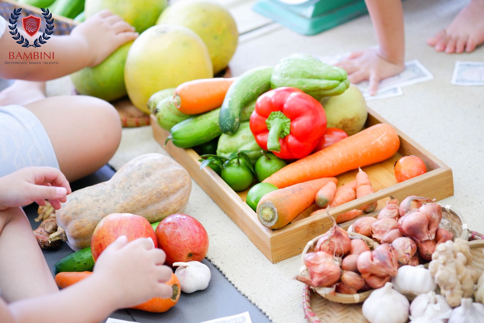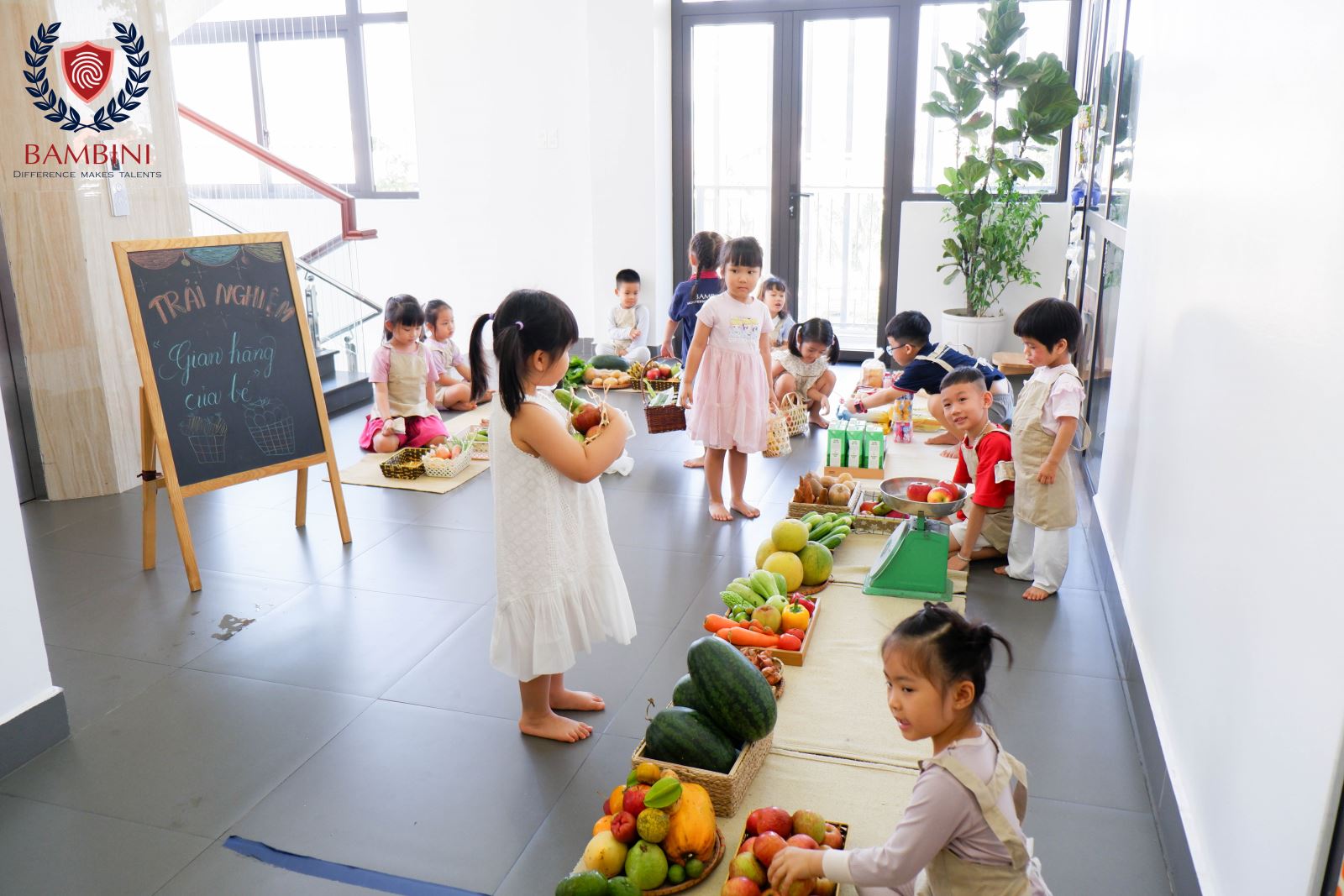 Các con vừa được nhận biết tên gọi, hình dạng của từng loại thực phẩm, vừa tập làm “người bán – người mua” trong phiên chợ mini đáng yêu.