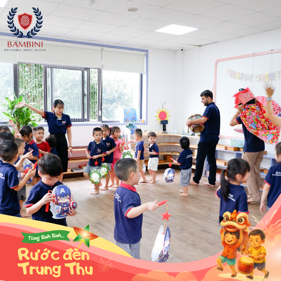 Trời chuyển sắc thu, không khí mát mẻ, dễ chịu, thêm chút hương cốm, hương bưởi và những chiếc bánh nướng, bánh dẻo đang dần xuất hiện báo hiệu Tết Trung thu đang đến thật gần. Không khí ở Bambini chúng mình cũng đã rộn ràng hơn bao giờ hết, trong chuỗi các hoạt động của sự kiện Vui Hội Trăng Rằm 2025 năm nay, các em bé đã được cùng nhau rước đèn, vui đùa cùng Chị Hằng, Chú Cuội, Ông Địa..... bám đuôi nhau nối 1 hàng dài, xếp sau bạn Lân vui vẻ, đánh trống, khui chiêng đi khắp các lớp học và ca vang bài hát “Chiếc đèn ông sao” đầy ắp tiếng cười.